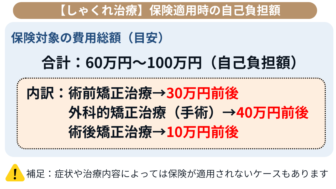 | 保険適用の治療 | 60万円〜100万円 ※3割負担の自己負担額目安 |