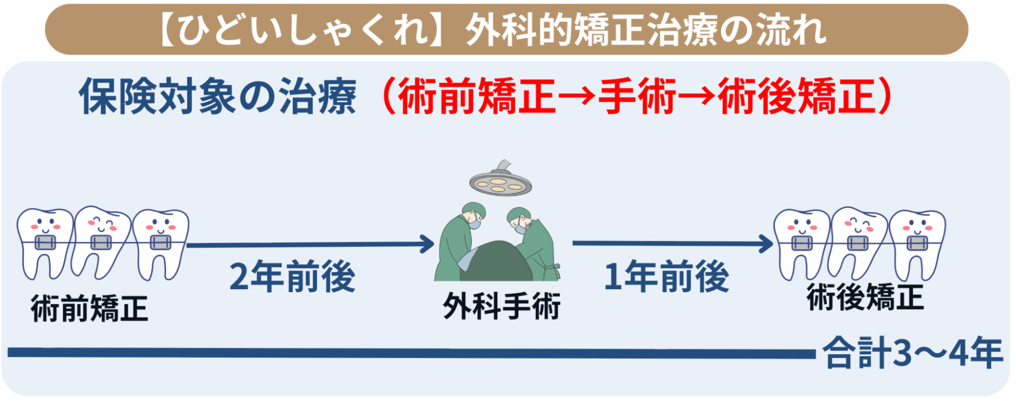 | 1.術前矯正治療 | 1〜2年前後 | 手術後のあごの位置に合わせて、歯並びを調整する |