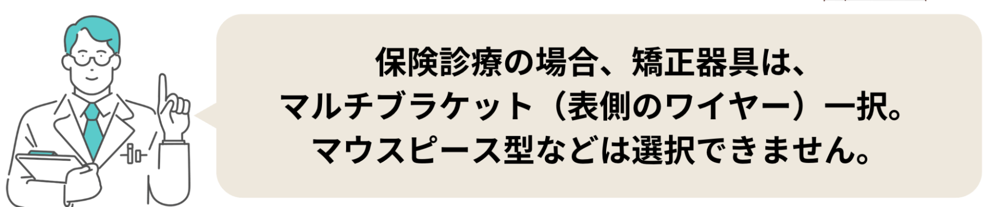 | その他の特徴 | ・保険診療の場合は、一般的な表側のワイヤー矯正(マルチブラケット装置)となり、マウスピースや裏側矯正は選択できない ・一時的にしゃくれがひどくなる場合がある ・抜歯の可能性がある ・定期的な通院(月1回程度)が必要になる |